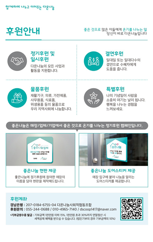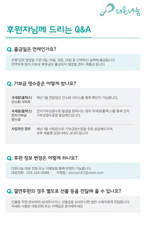 계좌번호 : 207-0184-6755-04 (예금주 : 다온나눔사회적협동조합)